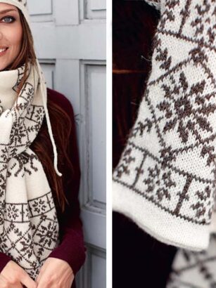 Длинный шарф, украшенный замысловатым узором, вяжется «рукавом», чтобы не было видно переходов нитей. Размеры 25 х 220 см ВАМ ПОТРЕБУЕТСЯ Пряжа (60% шерсти альпака, 10% шелка, 30% овечьей шерсти; 50 г/165 м) — 8 мотков белой, 5 мотков коричневой; …