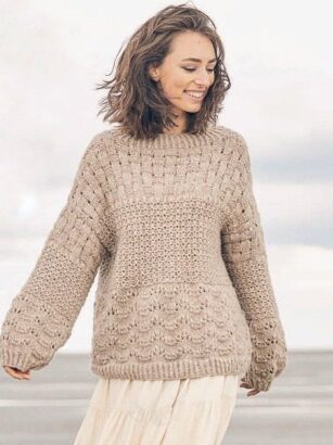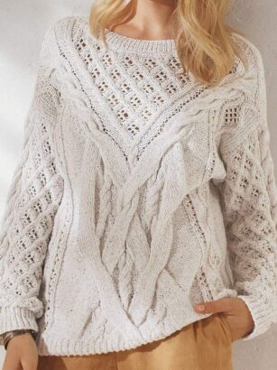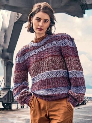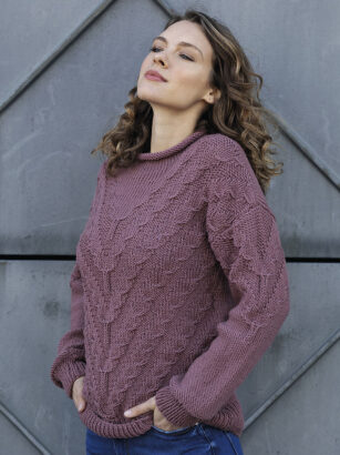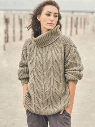 Это тот случай, когда понравился мне только узор, сама модель мне показалась грубой. То ли такое впечатление возникло из-за объемного патентного узора в сочетании с плотной вязкой, то ли из-за массивного воротника гольф. Узор взяла …
