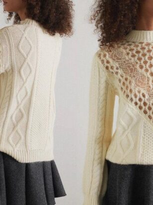 Кружевная тканевая вставка между деталями кокетки, связанными крупным ажурным узором, — прекрасная идея. Обратите внимание еще и на комбинацию плотного узора основного полотна и легкой воздушной кокетки.