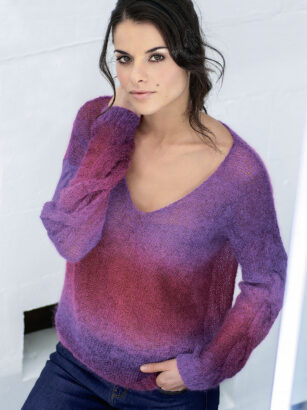 34/36 (38/40) 42/44 (46/48) 50/52 Пряжа Plassard Algashine секционного крашения (71% шерсти альпака, 15% шелка, 7% полиэстера, 7% металлизированного полиэстера; 210 м/25 г) — 4 (4) 5 (5) 5 мотков в ярких сиренево-розовых тонах (№ …