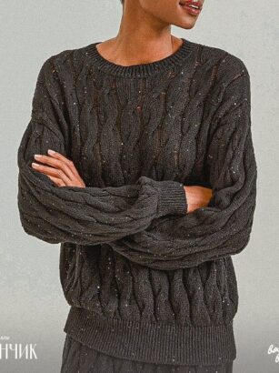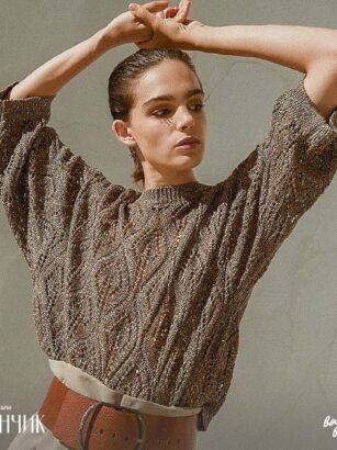 Джемпер со жгутами довольно лаконичен. Узор состоит из жгутов, между которыми проходят изнаночные петли. Первая изнаночная петля в каждой вертикальной дорожке снимается со спиц в конце вязания. …