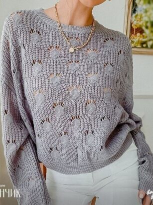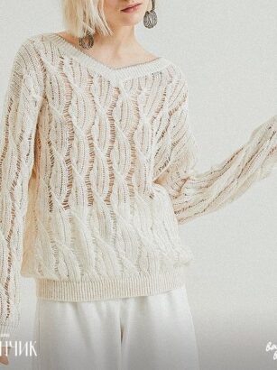 Ажурный трикотаж. Прямой фасон. Круглый вырез горловины. Длинные рукава. Горловина украшена воланами.