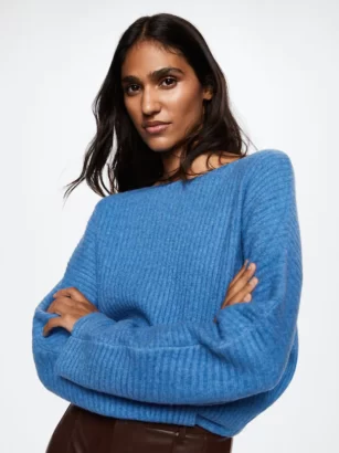 Толстая вязка. Трикотаж, связанный резинкой. Прямой фасон. Вырез-лодочка. Длинные рукава-реглан.