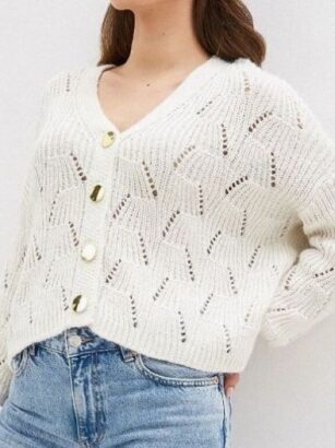 Толстая вязка. Трикотаж с косами. Прямой фасон. V-образный вырез горловины. Длинные рукава-фонарики. Спереди застежка на пуговицы. Обтянутые пуговицы