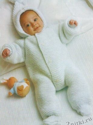 Вязаный комбинезон с капюшоном — очень удобно малышу и маме