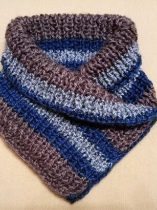 Вязала я ее на круговых спицах №4, нитки там разные, в 100-граммовом мотке 150-160г. Вся манишка связана резинкой 1х1 (одна лицевая, 1 изнаночная). Сначала вяжется прямоугольник высотой 15 см и шириной 60 см. Я набирала …