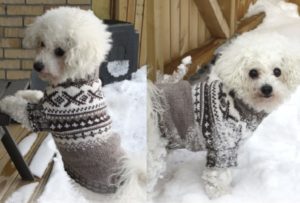 Свитер с норвежским узором в сером цвете будет шикарно смотреться на небольшой собачке (для карликового пуделя или йорка).