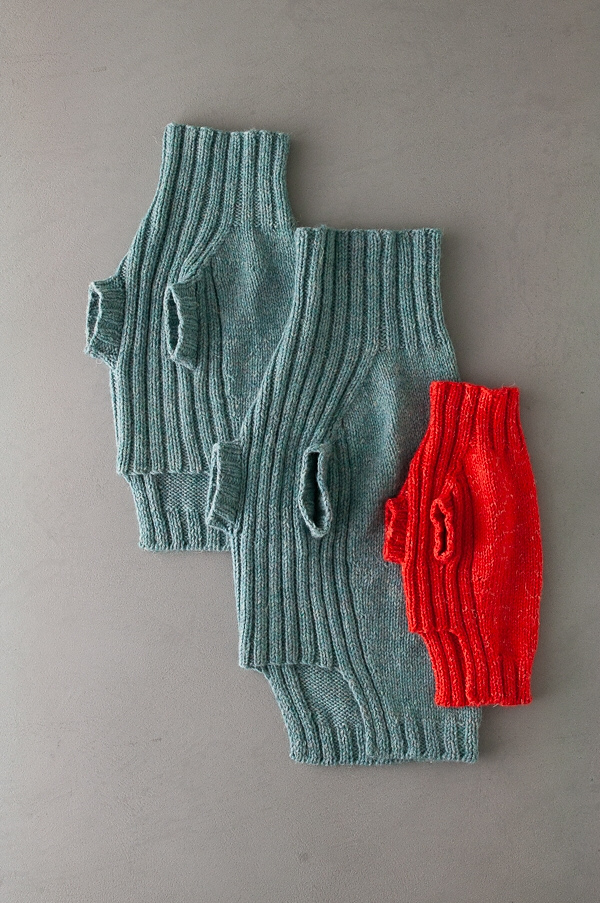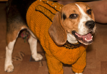 Плотность вязания свитера для собаки спицами: 19 петель и 27 рядов/ круг.р. = 10 см лицевой гладью.