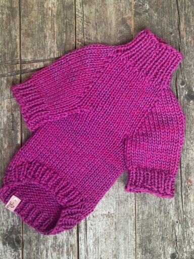 Далее вяжем до проймы. Это у нас длина между передней и задней лапой по боку минус ширина планируемой резинки, это 25-3 см=22 см. И нужно равномерно прибавить до ширины груди. По расчетам нужно прибавлять в