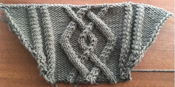 Отмечаем середину вязания. От неё отсчитываю петли ( получается 56, без кромочной), делим на 3, получается приблизительно 19 петель, для ровного счёта с боков откладываем на дополнительную нить по 20 петель с двух сторон.