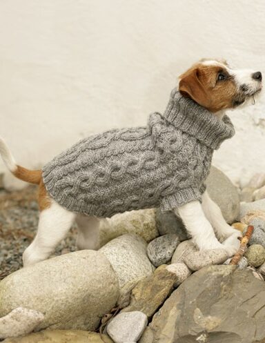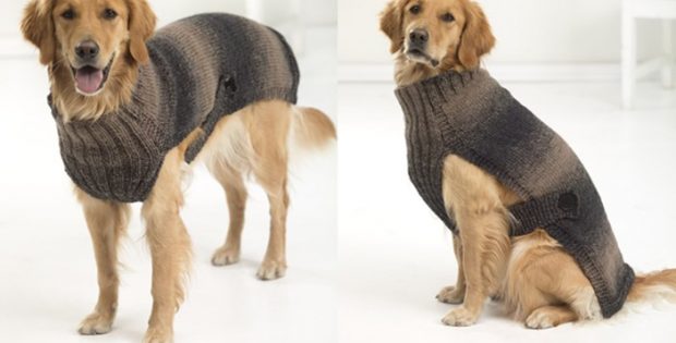 Вот такой вязаный спицами свитер для собачки можно смастерить своими руками. Диапазон размеров большой, благодаря тому, что по бокам свитера между передней частью и спинкой вставлены пояски – можно регулировать его окружность.