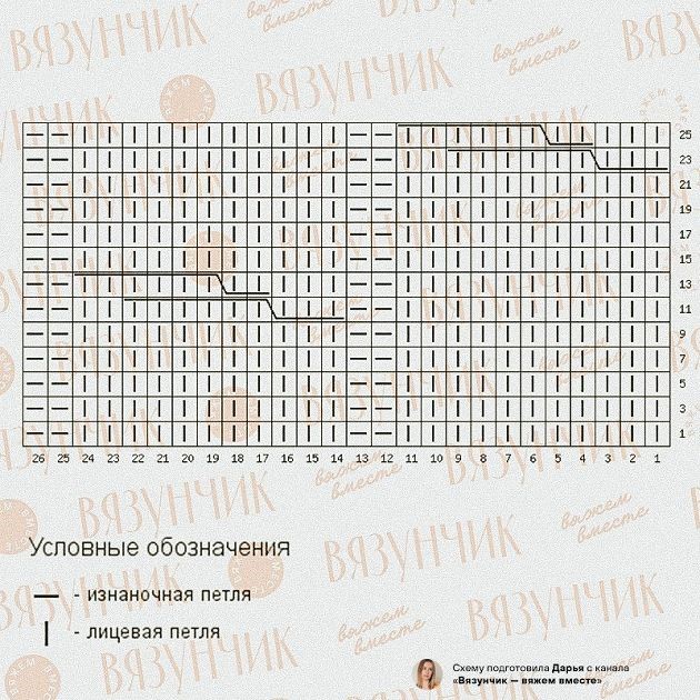 На схеме присутствуют только лицевые ряды. В изнаночных рядах вяжите петли по рисунку. Обозначения, которых нет на схемах — перекрещенные петли. Конкретно в этой схеме — влево.