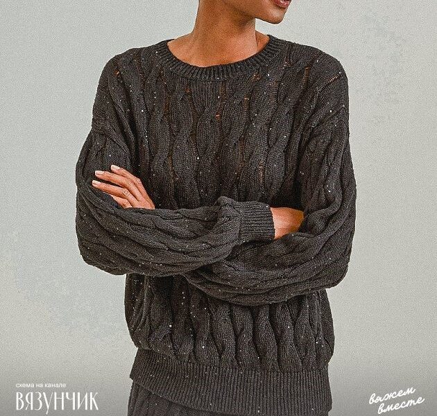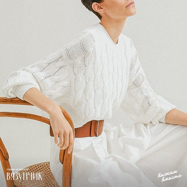 Джемпер со жгутами довольно лаконичен. Узор состоит из жгутов, между которыми проходят изнаночные петли. Первая изнаночная петля в каждой вертикальной дорожке снимается со спиц в конце вязания.