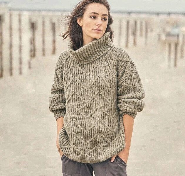 Это тот случай, когда понравился мне только узор, сама модель мне показалась грубой. То ли такое впечатление возникло из-за объемного патентного узора в сочетании с плотной вязкой, то ли из-за массивного воротника гольф. Узор взяла на заметку, свяжу его из чего-нибудь более воздушного.