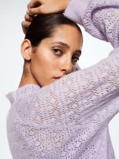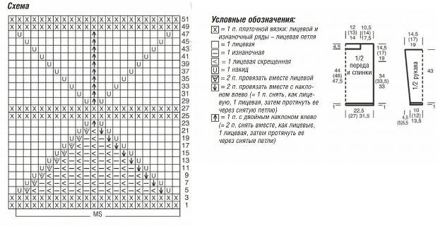 Джемпер выполнен прямыми деталями переда и спинки, рукава сужаются к манжете. Детали вяжутся в направлении снизу вверх. Детали вяжутся чередованием ажурных дорожек и геометрического узора, схема которого дана ниже.