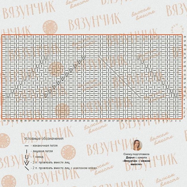 Я пробовала и так, и так. На сути узора это никак не сказывается. Главное — это система прибавлений и убавлений. Здесь накиды и убавления только в лицевых рядах, поэтому на схеме я оставила только лицевые ряды. В изнаночных вы вяжете изнаночные ряды резинки, которую выбрали.