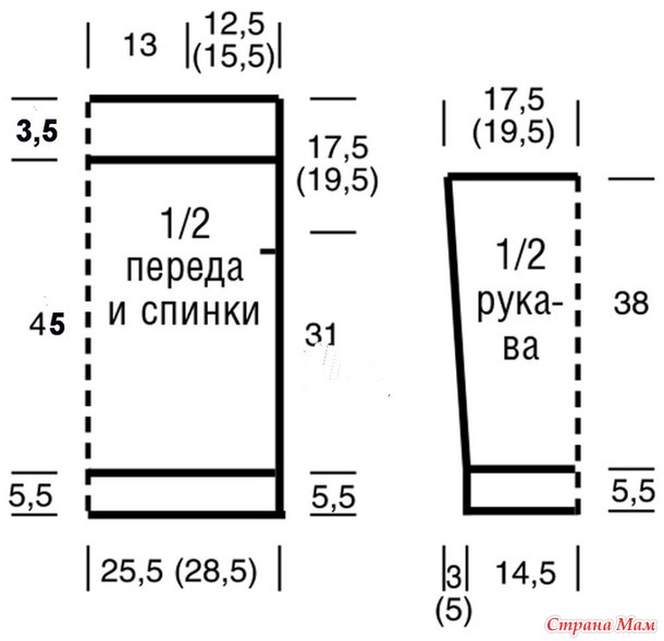 Одновременно подчеркнуто прибавить для скоса рукава с обеих сторон в каждом 15-м ряду от планки 6 x 1 п. (в каждом 10-м ряду 9 x 1 п.) = 62 (68) п.