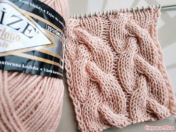 для 1-го размера начать с 1 кромочной, 7 раппортов узором с «косами» по 14 п., закончить раппортом 12 п. (без двух изн. п.), 1 кромочная.