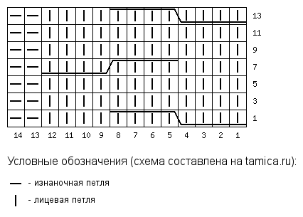 Для 2-го размера начать с 1 кромочной, на следующих 5 петлях — лиц. гладь, 2 изн. п., 8 раппортов по 14 п., на следующих 5 п. – лиц. гладь, закончить 1 кромочной.