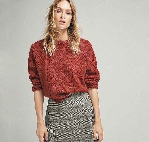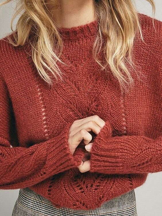 Модель очень приятная. Здесь сочетается лицевая гладь и спокойный ажурный узор из листьев, который сопровождается дорожками из накидов. Это сложно разглядеть на фотографии, но ажурный узор дублируется и на рукавах. В целом изделие, как и предыдущее, представляет собой вещь свободного оверсайз фасона со спущенной линией плеча.