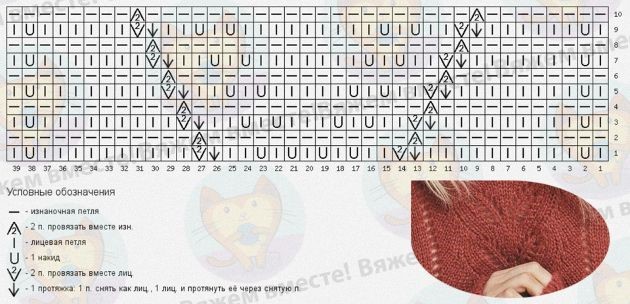 Схему ажура я представила ниже. На ней указаны и лицевые, и изнаночные ряды, будьте внимательны.