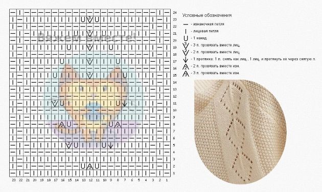 На схеме узора я обозначила и лицевые, и изнаночные петли.