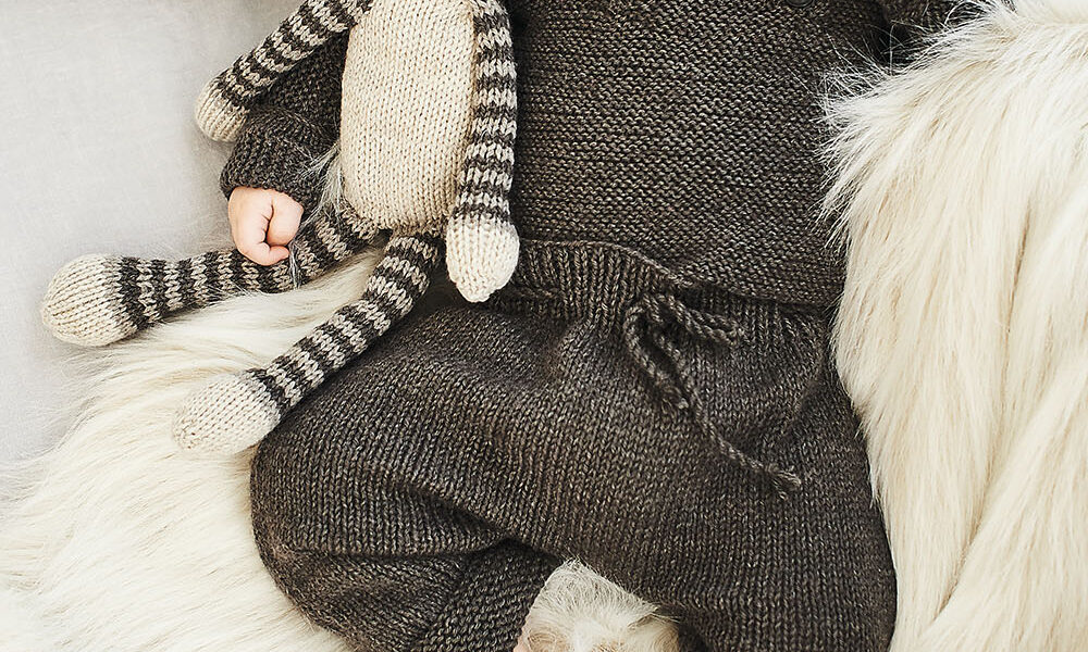 Пряжа Rico Design Baby Classic Dk (50% акрила, 50% полиамида; 165 м/ 50 г) — 2 (2) 3 (4) мотка меланжевой коричневой (№ 065) для пуловера и 2 (2) 3 (4) мотка для штанишек; спицы № 3,5 и 4; эластичный шнурок для пояса; булавки для снятия петель.