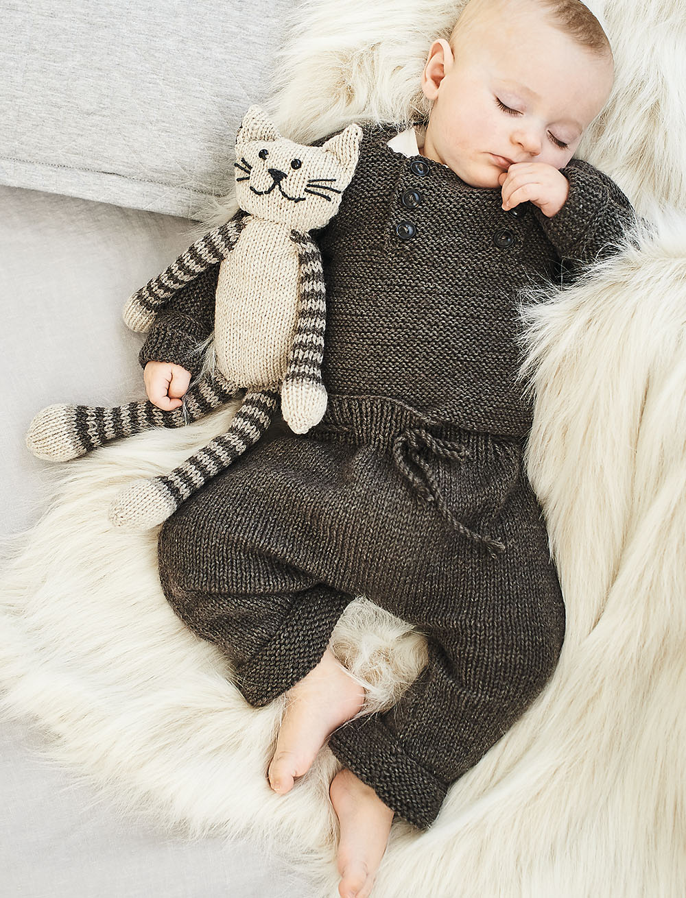 Цельновязаный пуловер с застежкой на пуговицы и удобные штанишки с отворотом образуют прекрасный костюм, в котором малышу будет тепло и удобно.