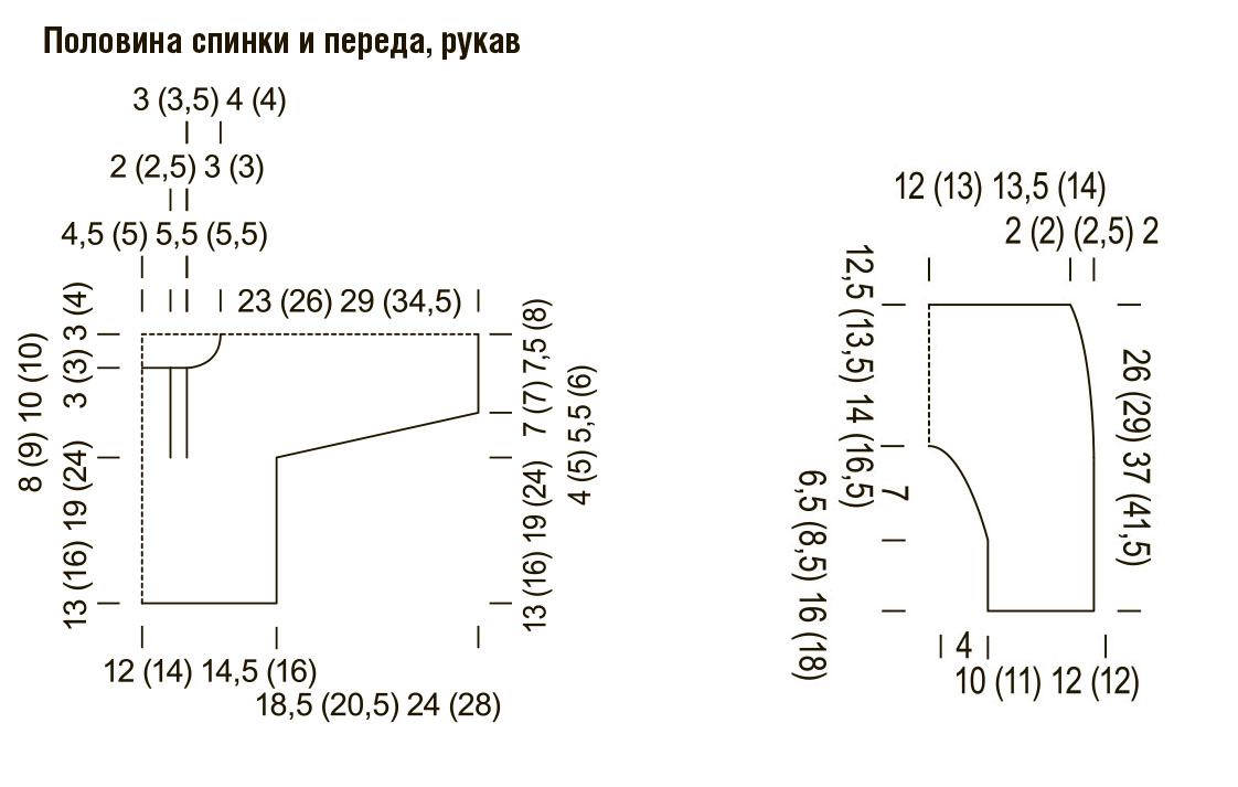В следующем ряду отложить для планки средние 20 (22) 24 (24) п. и обе стороны закончить раздельно. В этом же ряду набрать для рукава 3 п., затем вязать 17 (19) 20 (23) лиц.