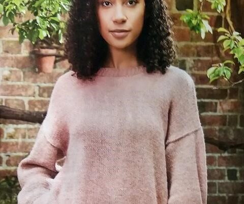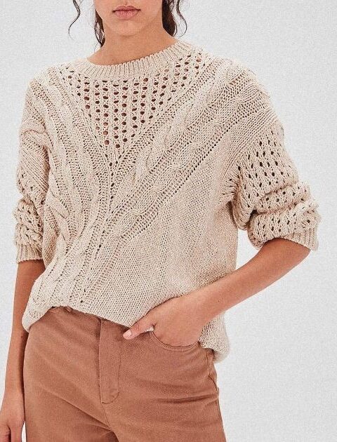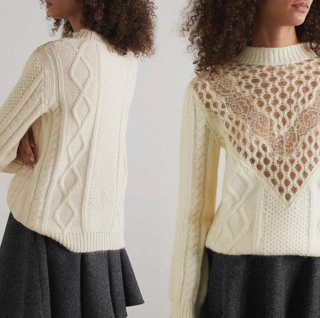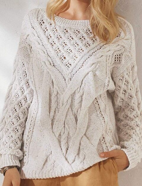 Кружевная тканевая вставка между деталями кокетки, связанными крупным ажурным узором, — прекрасная идея. Обратите внимание еще и на комбинацию плотного узора основного полотна и легкой воздушной кокетки.