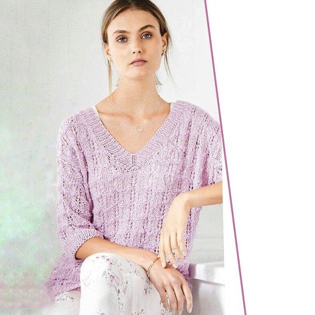 Раппорт узора состоит из 9 петель и 8 рядов, на схеме указаны только нечетные ряды петель. Для вязания пуловера используется пряжа, в состав которой входит 40% вискозы, 30% хлопка, 20% льна и 10% полиамида метражом …