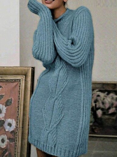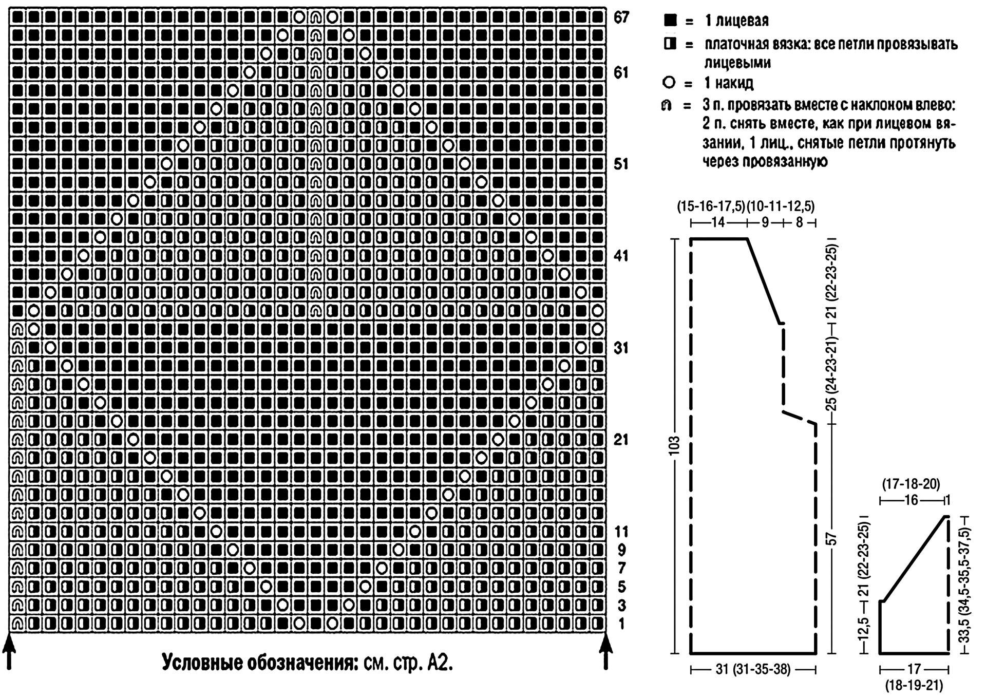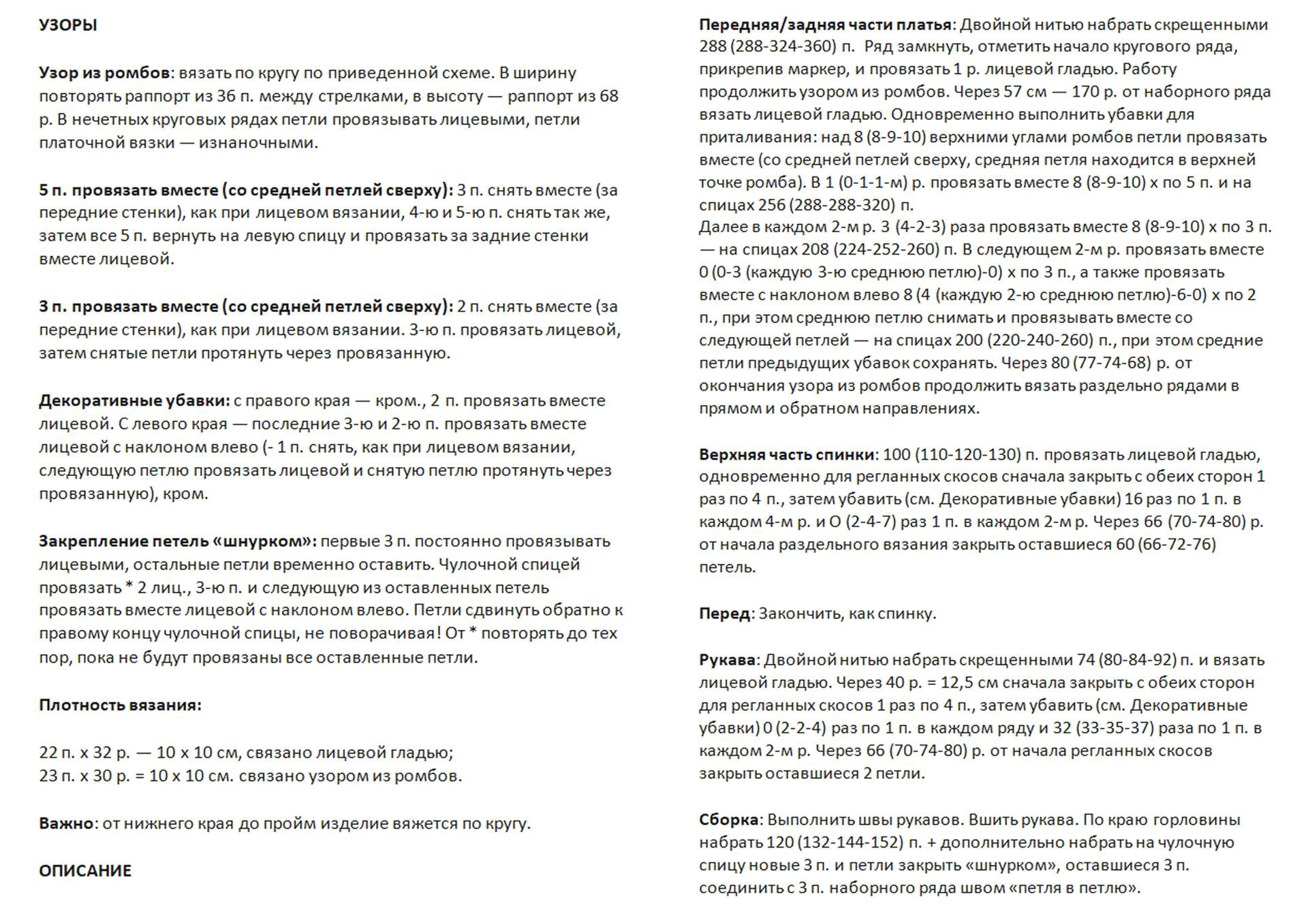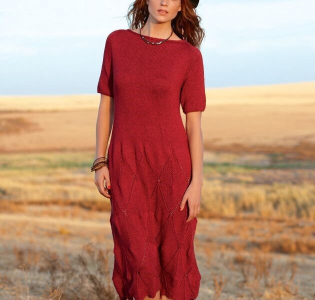На первый взгляд очень простое платье лицевой гладью. Главная изюминка кроется в , который идёт по низу платья — большие ромбы со вставками из платочного узора.