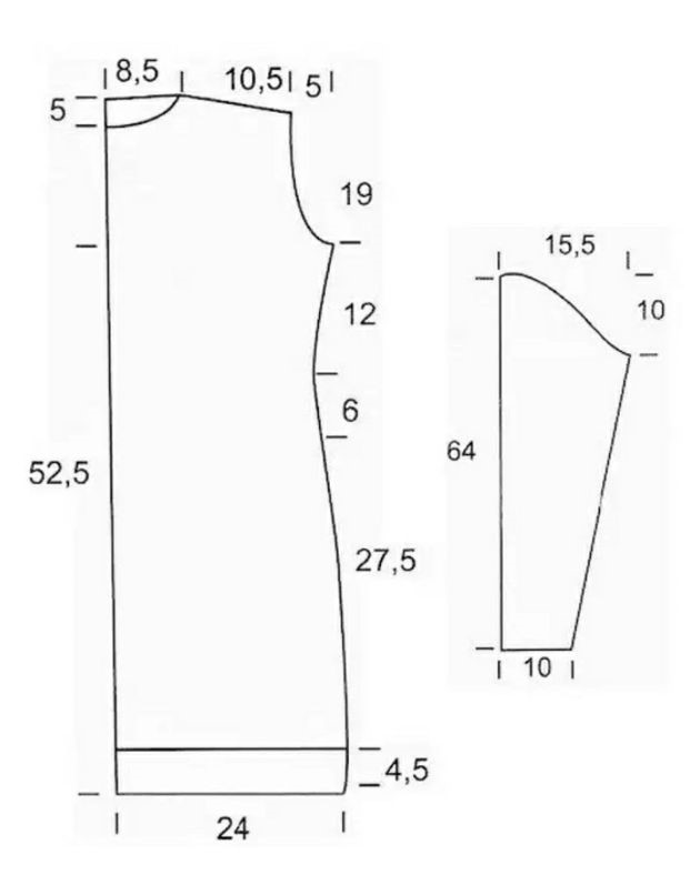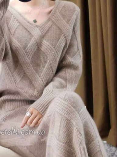 Платье связано на размер 42-44 из пряжи, в составе которой содержится кидмохер, хлопок и полиамид.