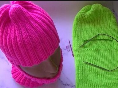 Затем набрать 31 (34) п. для переднего края шапочки, провязать лицевыми петли второго наушника и набрать 21 (24) п. для заднего края шапочки = на спицах 100 (110) п.