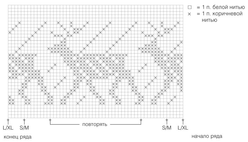 Пряжа (60% шерсти альпака, 10% шелка, 30% овечьей шерсти; 50 г/165 м) — 2 мотка белой, 1 моток коричневой; спицы №4,5; круговые спицы №4,5 (40 см); чулочные спицы №4,5; крючок №3,5.