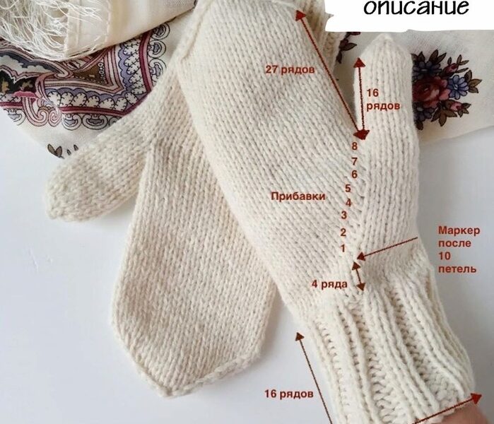 Для левой рукавицы маркер ставим после 8-ми петель с начала ряда и прибавки делаем после маркера, скрещенным влево накидом.