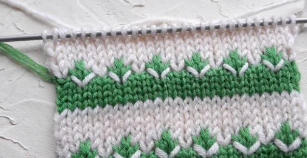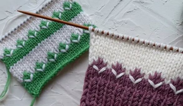 Также вязать 5 рядов лицевой гладью зеленым цветом, поменять нить (желтый цвет) и продолжить вязание по описанию: