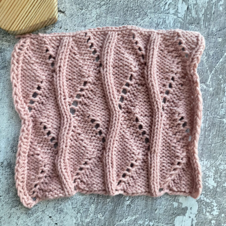 В ширину начать с кромочной петли, повторять раппорт, закончить кромочной петлей.