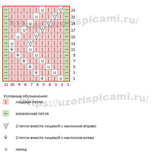 Раппорт узора составляет 11 петель + 2 кромочные и 24 ряда. На схеме даны только лицевые (нечетные) ряды. В изнаночных (четных) рядах все петли вязать по рисунку.
