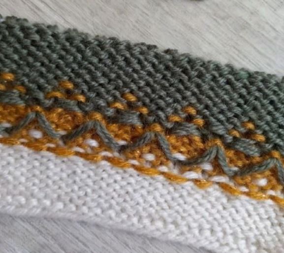 8 ряд — кромочная, петли рыжего цвета провязываем лицевыми, белые петли снимаем без провязывания ( нить за работой), кромочная.