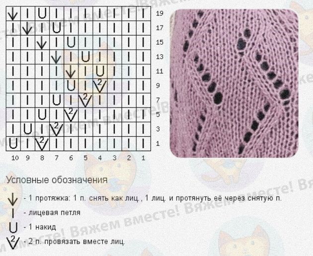 Четные ряды схемы вяжутся так, как лежат петли на спице, накиды изнаночными при поворотном вязании и лицевыми при вязании по кругу.