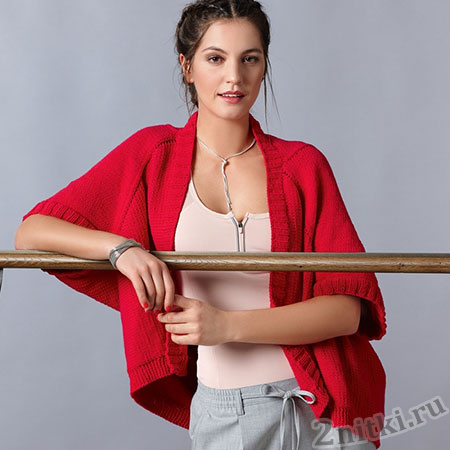 Пряжа (50% хлопка, 50% полиакрила; 130 м/50 г) — 450 (450–500–550) г малиновой; спицы №4 и 4,5; круговые спицы №4 длиной 40 и 80 см.