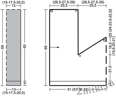 Через 25,5 (26,5–27,5–29) см = 68 (72–74–78) р. от начала прибавок оставшиеся 84 (86–87–89) п. временно оставить.